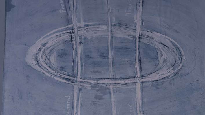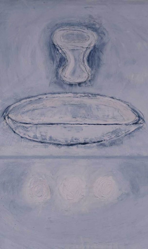 A la part central del tríptic trobem el Calze i la Patena, símbols de l’Eucaristia. A sota de la patena apareixen tres punts blancs que simbolitzen la Trinitat: Pare, Fill i Esperit Sant activament presents en tota celebració eucarística.