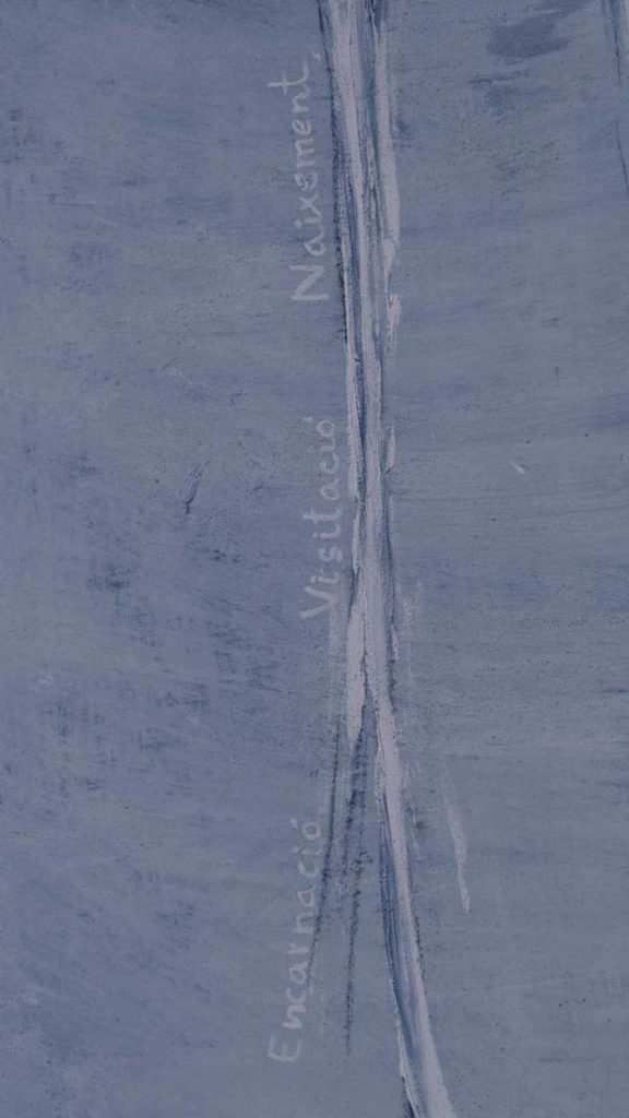 Sobre les línies es distingeixen unes paraules que rememoren els misteris del Sant Rosari. Són vint paraules que recorden els principals moments de la vida de Jesús, compendi de l’Evangeli. D’aquesta manera es vol significar que els misteris de la nostra redempció són un do de l’Esperit pel qual Déu s’encarna per venir a nosaltres (els misteris de l’Encarnació i els de Llum – panell de l’esquerra), es lliura per nosaltres fins a la mort i ressuscita portant-nos a nosaltres amb Ell a la Glòria (els misteris de Dolor i els de Glòria – panell de la dreta).